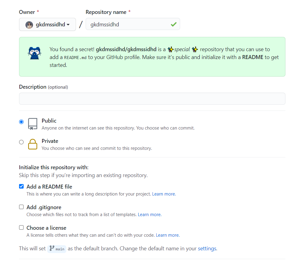 레파지토리를 나의 닉네임이랑 똑같이 만들어놓으면 저렇게 초록색 글과 고양이가 뜬다.